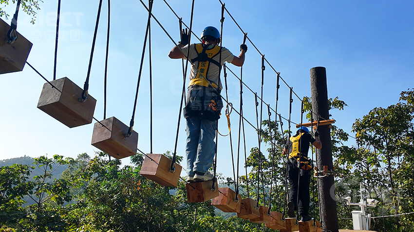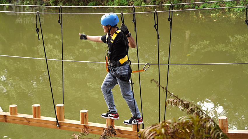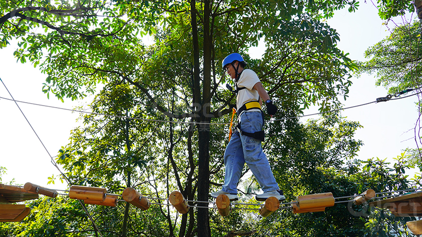 作為入門級線路,體驗線高度適中,環(huán)節(jié)設(shè)置溫和有趣。包含短距離的獨木橋、蘑菇橋和交叉秋千橋等。它旨在幫助游客,尤其是孩子們,消除恐高心理,建立自信,初步掌握平衡與協(xié)調(diào)能力。