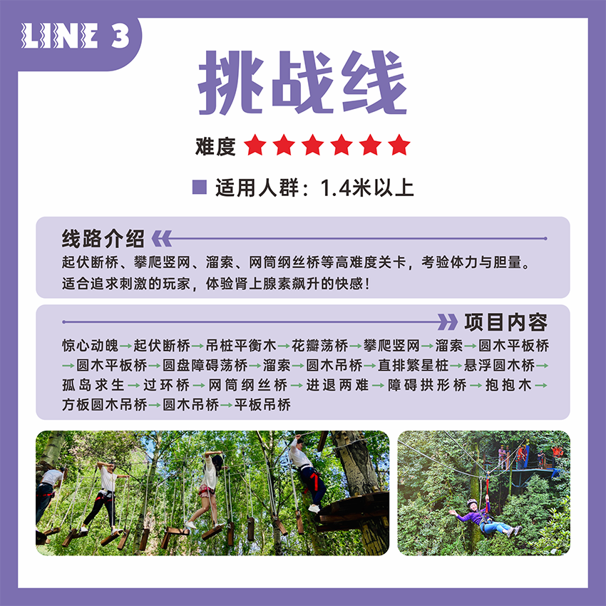 專為勇敢者準備的進階之路!挑戰(zhàn)線擁有更高的平臺、更長的滑索和更復(fù)雜的障礙組合,如連續(xù)高空吊樁、Z字形平衡木、溜索、進退兩難等。每一步都在考驗?zāi)愕捏w力、耐力和心理素質(zhì)。