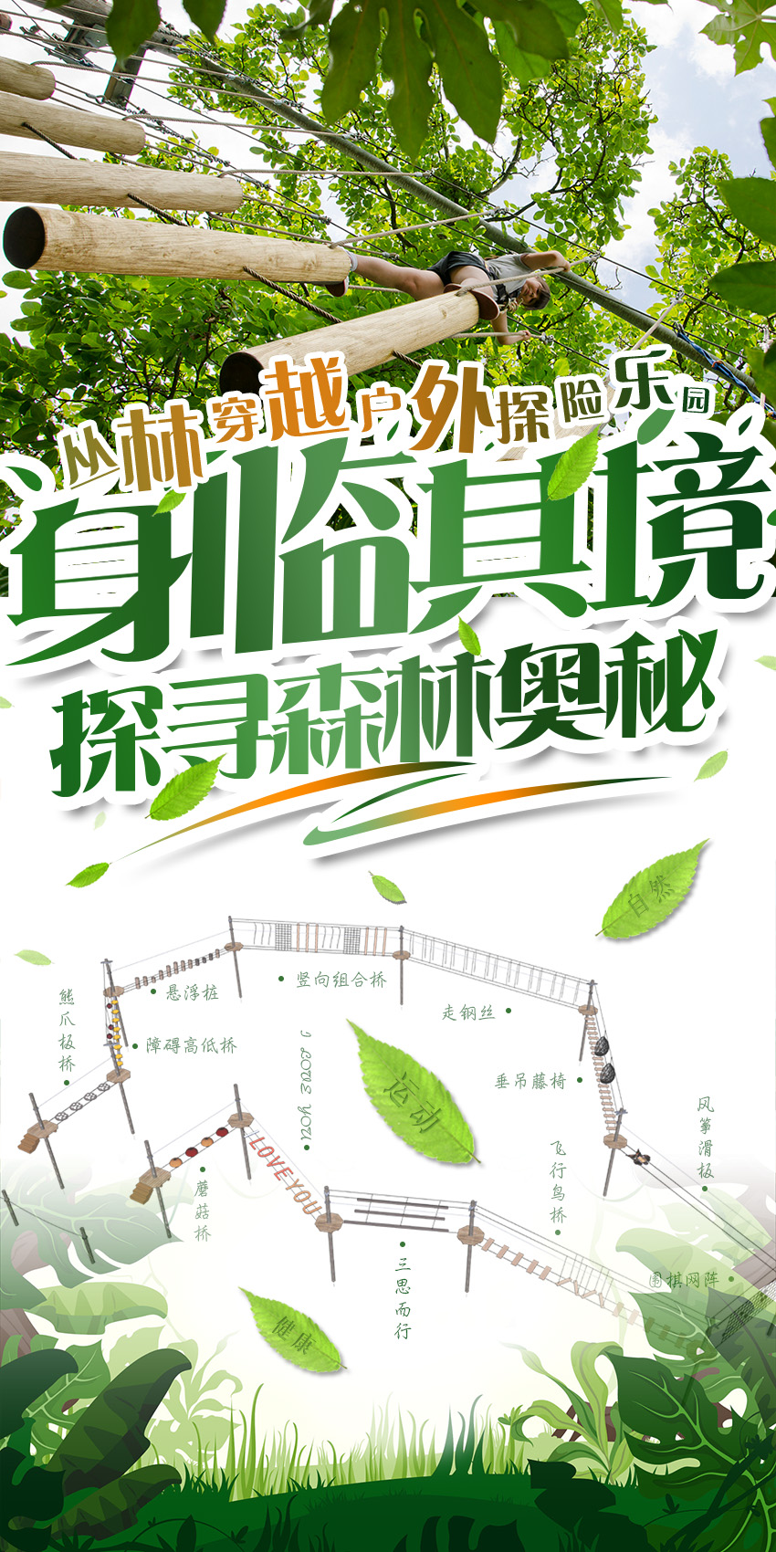 項目:熊爪板橋、障礙高低橋、懸浮樁、豎向組合橋、走鋼絲、垂吊藤椅、風箏滑板、圍棋網陣、飛行鳥橋、三四而行、I LOVE YOU、蘑菇橋等