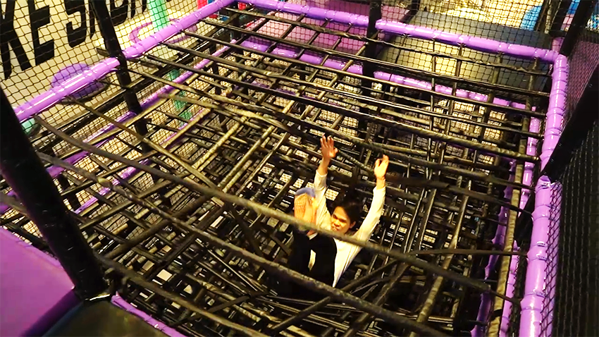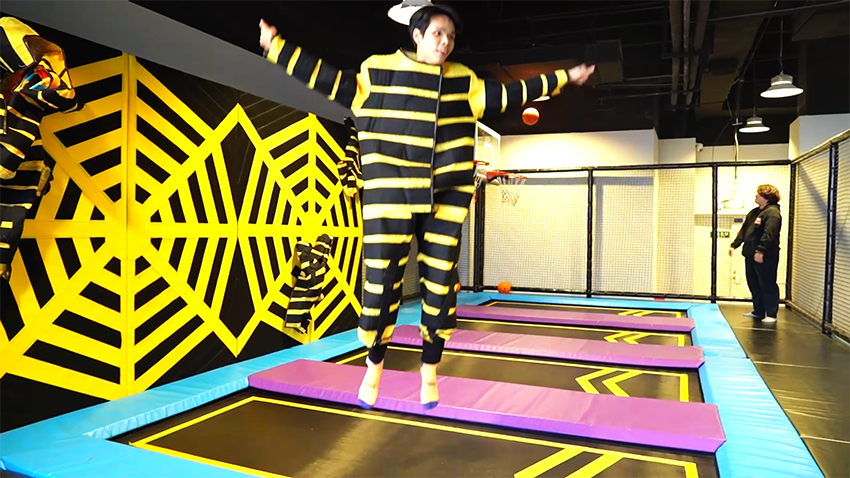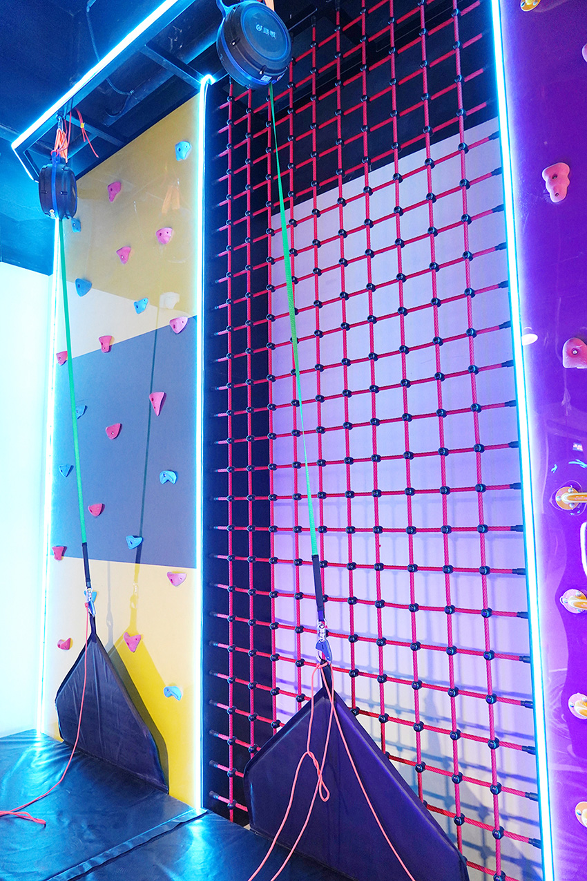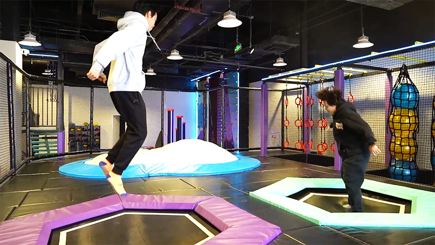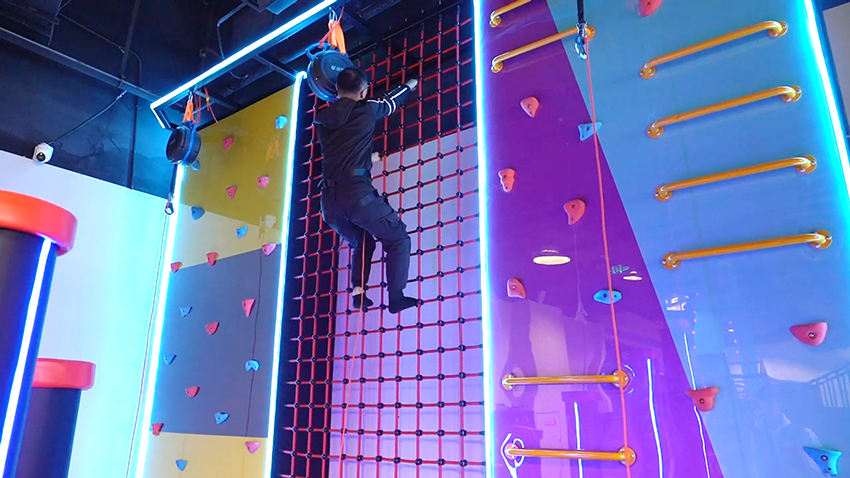特制的衣服,通過蹦床的彈力,可以粘貼在覆蓋有魔術貼的墻壁上,從而實現(xiàn)“飛檐走壁”的體驗效果。
