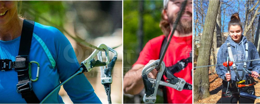 3、用未鎖定的登山扣扣住安全繩才能把另- -個登山扣解鎖并與前一個生命安全繩分離,并繼續(xù)通過繩索路線。