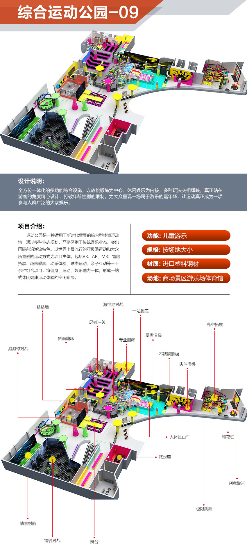 本項(xiàng)目適用于各種親子主題類的樂園,巧妙運(yùn)用“熊貓”IP造型設(shè)計(jì),集拓展、探險(xiǎn)、滑道、飛索、蹦極、不銹鋼滑梯、攀巖、爬網(wǎng)等46種不同運(yùn)動(dòng)體驗(yàn)的文化主題項(xiàng)目,結(jié)合“大灰熊”IP形象,融入相關(guān)設(shè)計(jì)元素,打造差異化的網(wǎng)紅IP主題性運(yùn)動(dòng)拓展?fàn)I地綜合體。 在裝飾設(shè)計(jì)上采用竹葉和竹竿的綠色設(shè)計(jì)元素,以原生態(tài)、自然風(fēng)格為基調(diào),采用原木、繩網(wǎng)和不銹鋼等柔韌度好的生態(tài)材料。滿足大眾貼近自然、主題鮮明、寓教于樂的兒童素質(zhì)訓(xùn)練教育親子樂園的精神訴求。