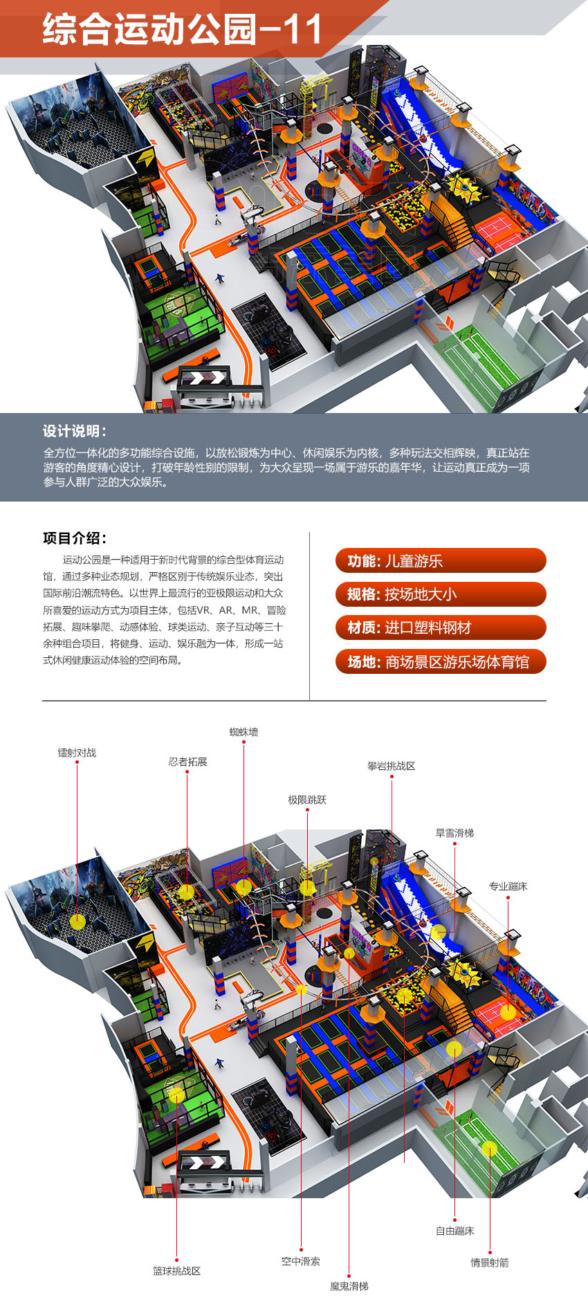 運動公園是一種適用于新時代背景的綜合型體育運動館,通過多種業(yè)態(tài)規(guī)劃,嚴(yán)格區(qū)別于傳統(tǒng)娛樂業(yè)態(tài),突出國際前沿潮流特色。以世界上最流行的亞極限運動和大眾所喜愛的運動方式為項目主體,包括VR、AR、MR、冒險拓展、趣味攀爬、動感體驗、球類運動、親子互動等三十余種組合項目,將健身、運動、娛樂融為一體,形成一站式休閑健康運動體驗的空間布局。