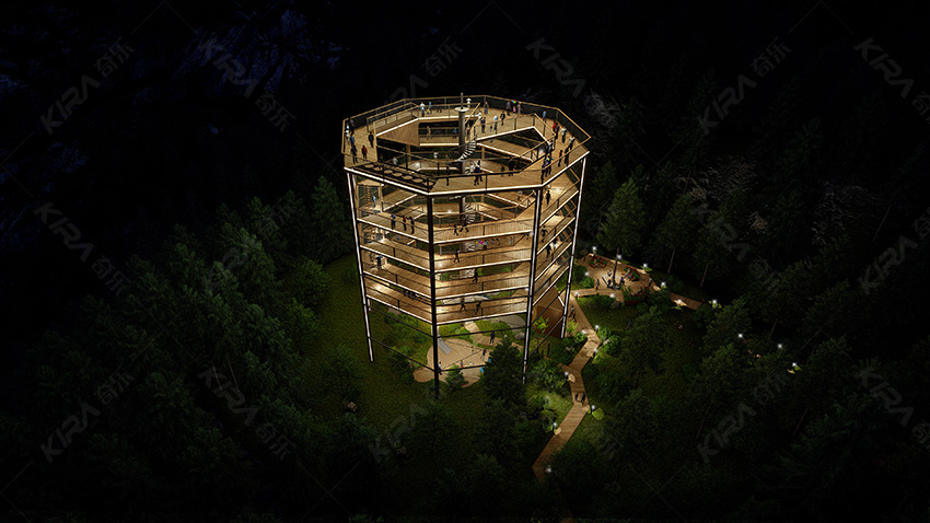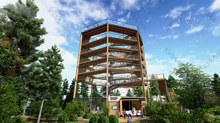 1、塔長23米,寬23米,高25米,由八根立柱圍合成正八邊形; 2、售票處位于塔體外側(cè),并設(shè)有鋼構(gòu)樓梯,上行8米到達(dá)一層平臺; 3、一層平臺往上可通過螺旋木棧道到達(dá)塔頂,棧道分五層,每層高三米; 4、一層平臺處設(shè)有旋轉(zhuǎn)滑梯,可劃至塔底,滑梯直徑0.95米,總長33米; 5、底層設(shè)有臨時商店,可為游客提供簡易餐飲; 6、出入口進(jìn)行分流設(shè)計,避免擁堵,給游客營造一個良好的游玩環(huán)境,也方便景區(qū)管理。
