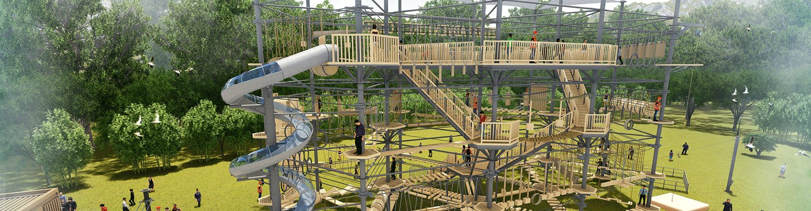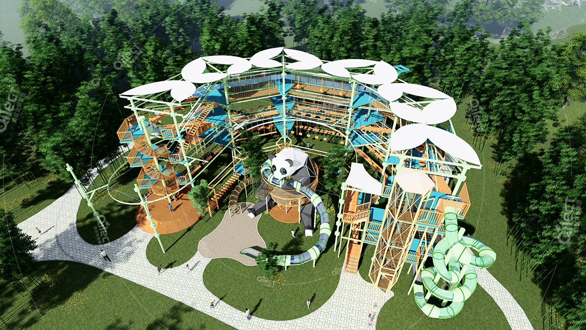 本項目適用于各種親子主題類的樂園,巧妙運用“大灰熊”IP造型設計,集拓展、探險、滑道、飛索、蹦極、不銹鋼滑梯、攀巖、爬網等46種不同運動體驗的文化主題項目,結合“大灰熊”IP形象,融入相關設計元素,打造差異化的網紅IP主題性運動拓展營地綜合體。 在裝飾設計上采用竹葉和竹竿的綠色設計元素,以原生態、自然風格為基調,采用原木、繩網和不銹鋼等柔韌度好的生態材料。滿足大眾貼近自然、主題鮮明、寓教于樂的兒童素質訓練教育親子樂園的精神訴求。