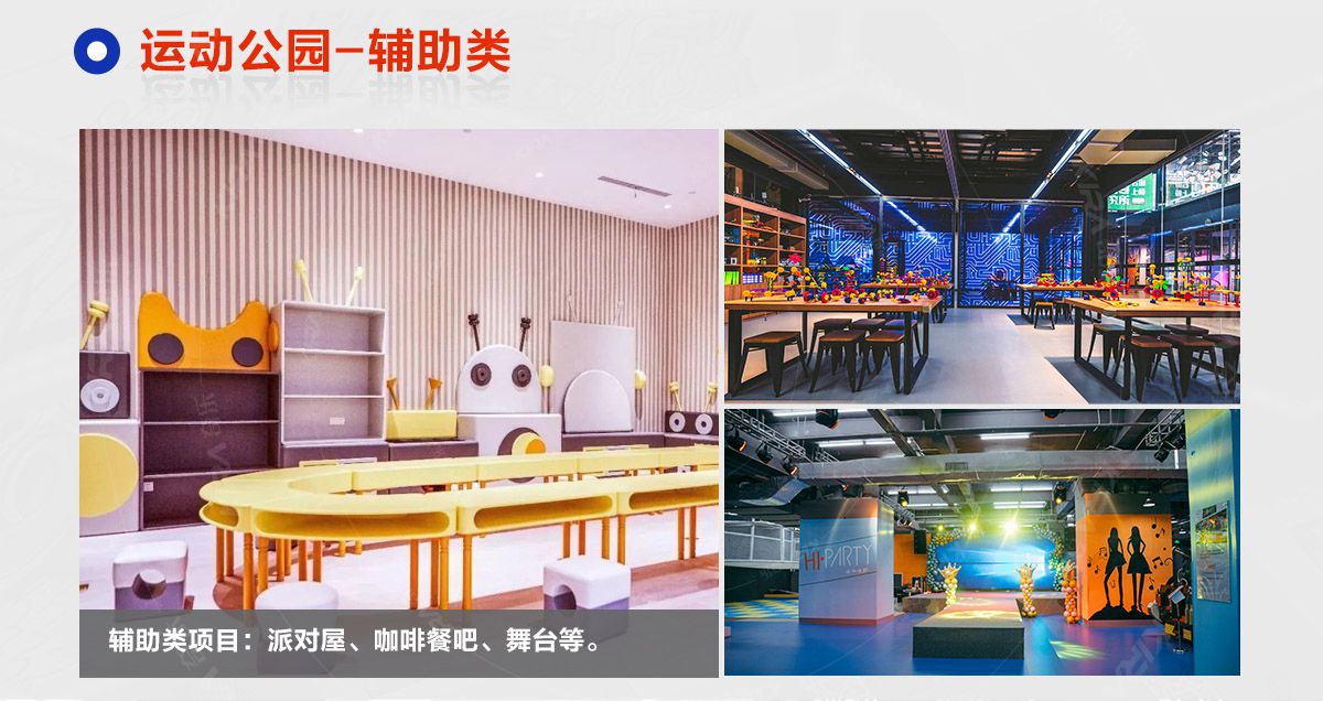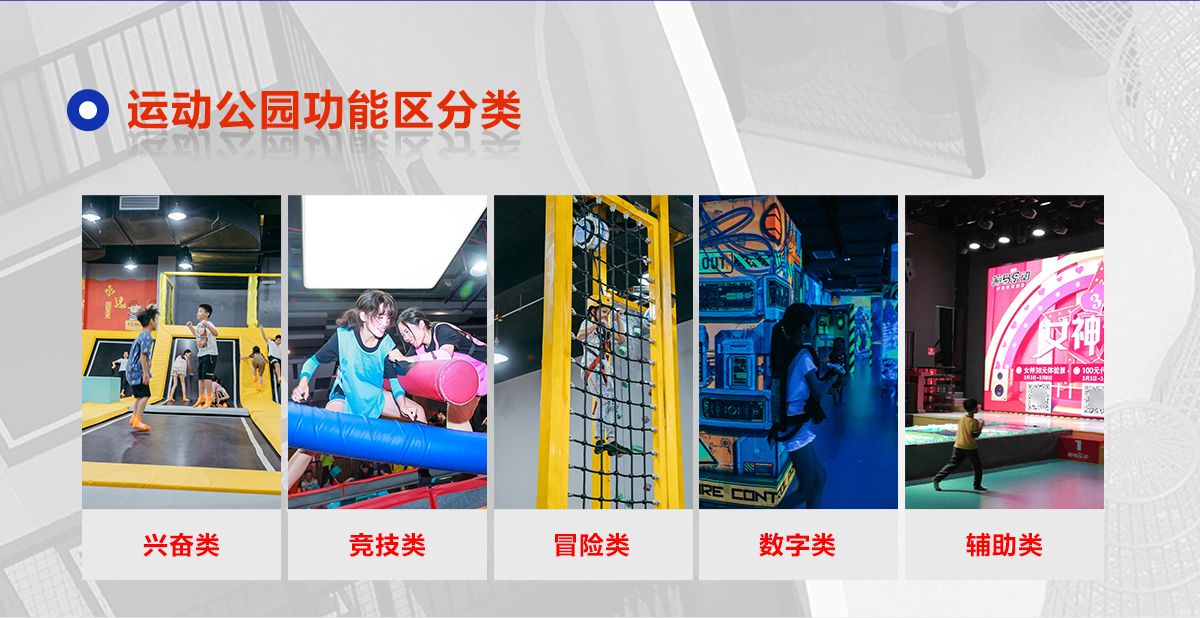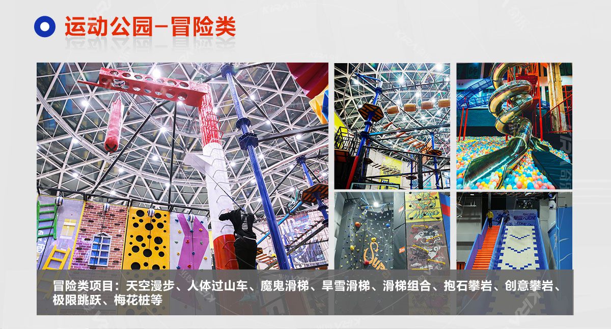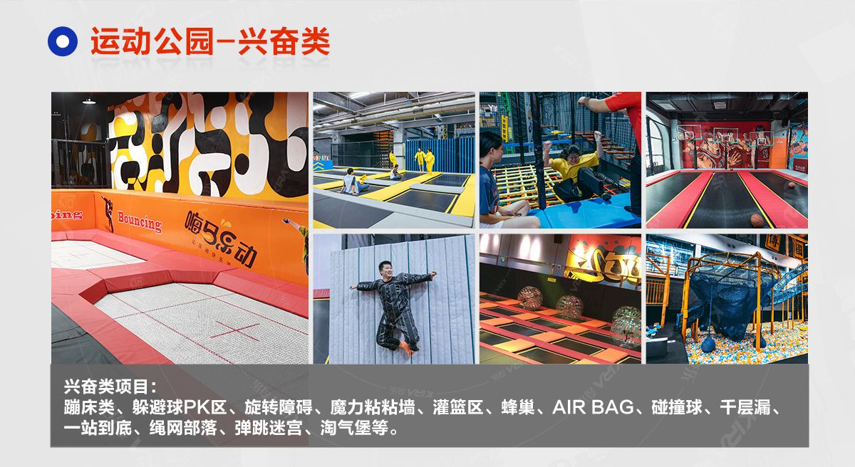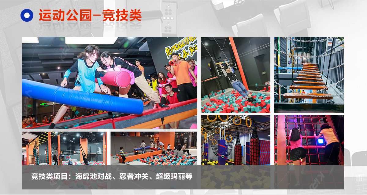 超級(jí)運(yùn)動(dòng)公園源自美國(guó),以業(yè)態(tài)分布劃分,可分為成人娛樂版塊、兒童娛樂版塊、潮流科技及輔助配套四大功能版塊;以運(yùn)動(dòng)程度劃分,可分為基本區(qū)、興奮區(qū)、冒險(xiǎn)區(qū)、數(shù)字科技區(qū)、輔助區(qū)。適合全年齡段玩家參與娛樂,打破年齡、性別、愛好等限制,為大眾呈現(xiàn)一幅“快樂運(yùn)動(dòng) 有氧生活”的精彩運(yùn)動(dòng)娛樂公園。 高格調(diào)與國(guó)際接軌的優(yōu)質(zhì)項(xiàng)目,引領(lǐng)玩家突破常規(guī)的運(yùn)動(dòng)局限,體驗(yàn)全新的運(yùn)動(dòng)嘉年華:自由蹦床區(qū)、跑酷區(qū)、躲避球PK區(qū)、灌籃區(qū)、AIR BAG跳躍區(qū)、粘粘墻、背摔臺(tái)、奧運(yùn)蹦床區(qū)、海綿坑、忍者沖關(guān)、飛狐塔、滑索、彈跳迷宮、魔鬼滑梯、旱雪滑梯、拓展攀爬、創(chuàng)意攀巖、抱石攀巖、極限跳躍、天空漫步、梅花樁、冒險(xiǎn)塔、科技互動(dòng)類等三十余種項(xiàng)目。