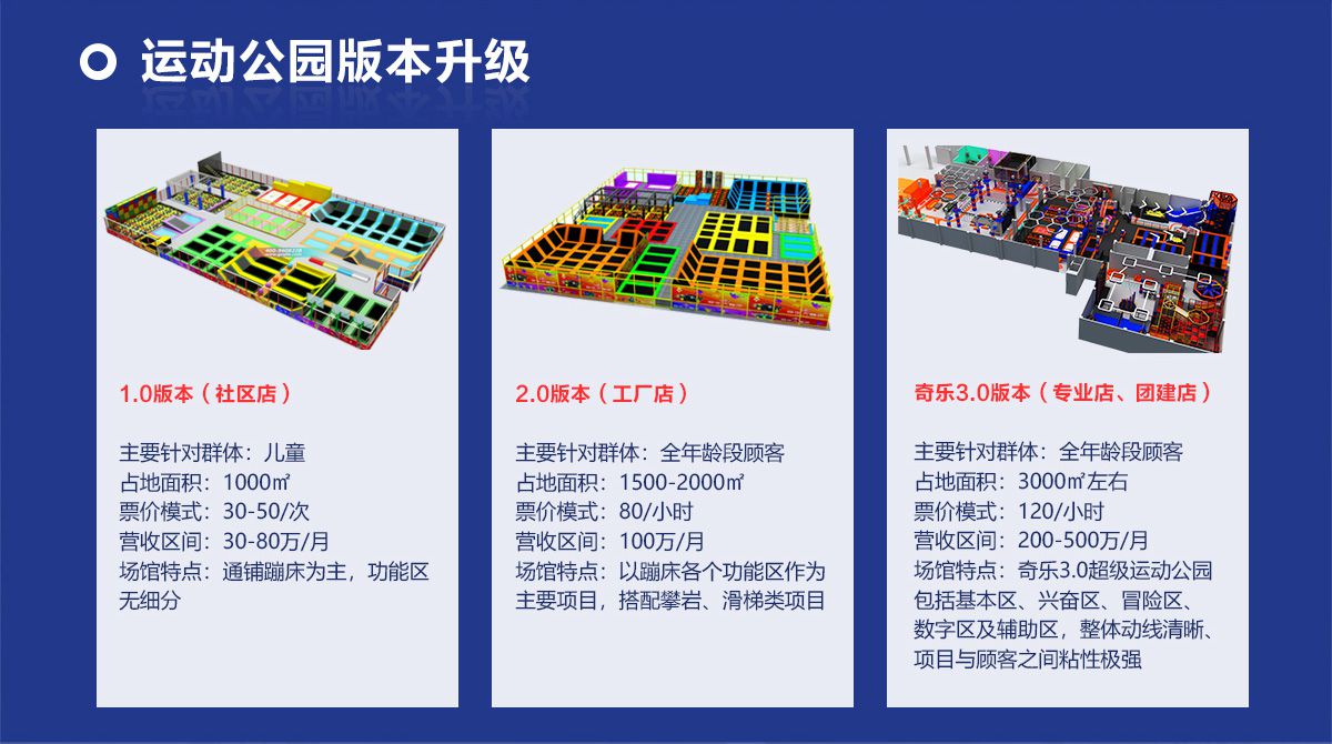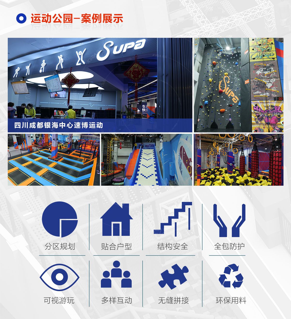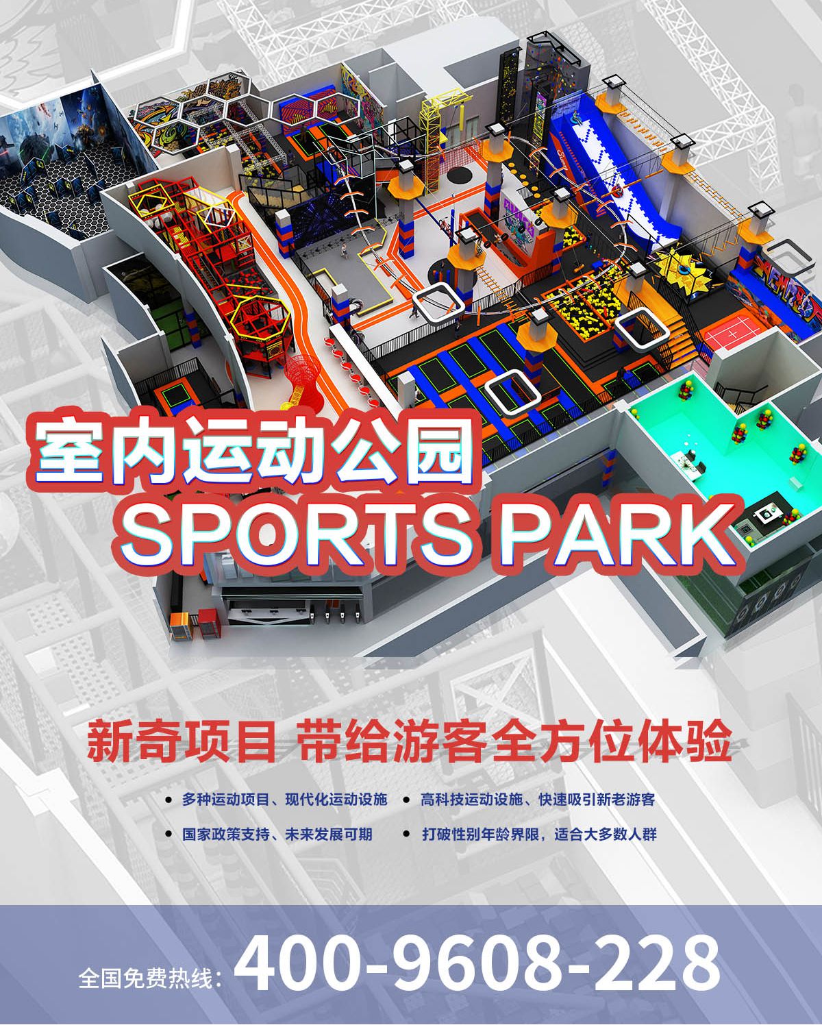 超級(jí)運(yùn)動(dòng)公園源自美國(guó),以業(yè)態(tài)分布劃分,可分為成人娛樂版塊、兒童娛樂版塊、潮流科技及輔助配套四大功能版塊;以運(yùn)動(dòng)程度劃分,可分為基本區(qū)、興奮區(qū)、冒險(xiǎn)區(qū)、數(shù)字科技區(qū)、輔助區(qū)。適合全年齡段玩家參與娛樂,打破年齡、性別、愛好等限制,為大眾呈現(xiàn)一幅“快樂運(yùn)動(dòng) 有氧生活”的精彩運(yùn)動(dòng)娛樂公園。 高格調(diào)與國(guó)際接軌的優(yōu)質(zhì)項(xiàng)目,引領(lǐng)玩家突破常規(guī)的運(yùn)動(dòng)局限,體驗(yàn)全新的運(yùn)動(dòng)嘉年華:自由蹦床區(qū)、跑酷區(qū)、躲避球PK區(qū)、灌籃區(qū)、AIR BAG跳躍區(qū)、粘粘墻、背摔臺(tái)、奧運(yùn)蹦床區(qū)、海綿坑、忍者沖關(guān)、飛狐塔、滑索、彈跳迷宮、魔鬼滑梯、旱雪滑梯、拓展攀爬、創(chuàng)意攀巖、抱石攀巖、極限跳躍、天空漫步、梅花樁、冒險(xiǎn)塔、科技互動(dòng)類等三十余種項(xiàng)目。