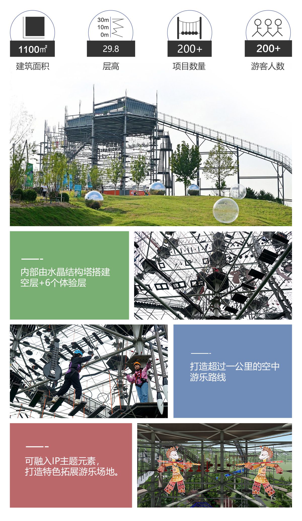 匯集 200 種游樂步道,適合廣大游客 水晶塔集冒險、運動、娛樂、挑戰于一體的綜合游樂類項目,通過在塔內設置并搭建各種難易不同、風格迴異、超強刺激的步道關卡,讓游客體驗高空墜落與自由滑翔的快感,感受塔內項目攀爬穿越的刺激。水晶塔是一個創新且極具盈利能力的全新休閑旅游項目,適合建在戶外,也可以建在窒內。 晶體結構,更穩固,更安全 水晶塔采用品體結構設計,每4根立柱為1個晶體結構,可根據客戶需求自由組合,晶體結構設計更大的增加設備的穩定性、利用率,保證客戶場地的實用率最大化,立柱之間做連桿支撐,根據結構設置觀景臺,可達 80~1000+m?,可作為餐飲,休閑吧,咖啡吧,酒吧等休閑休息區域,平臺下方懸空架連接桿支撐,平臺可同時承載 30-1000+人。 搭配我司自主研發生命系統,保障安全無死角自主研發自鎖式雙掛鉤,相互交替型安全保障永遠保證有一個掛鉤自鎖在鋼絲繩上面,保障安全無死角。